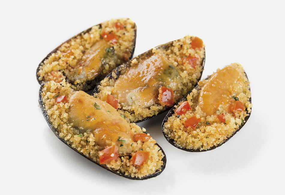 The mussels are stuffed one by one with tomato-flavoured bread, following the traditional recipe of this dish. Ready to be put in the oven, they save the chef a lot of time and work, guaranteeing a fast preparation.
